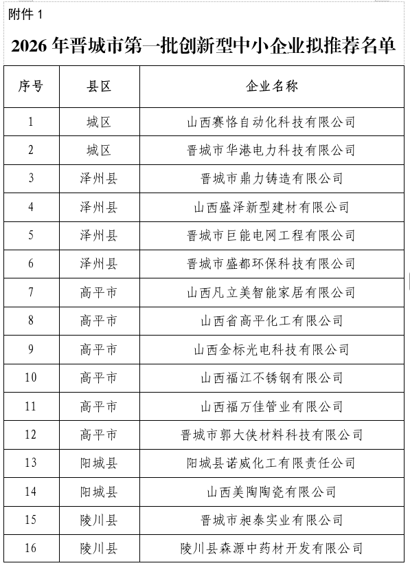 1.2026年晋城市第一批创新型中小企业拟推荐名单