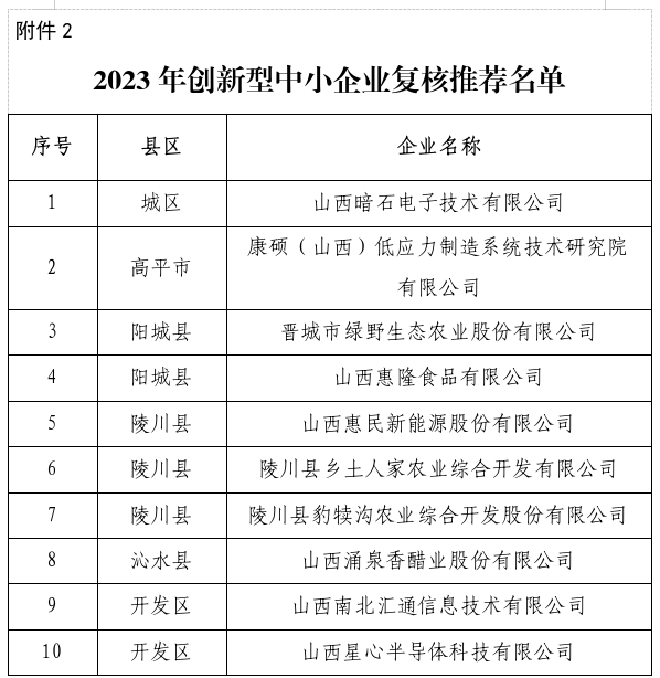 根据山西省工业和信息化厅《关于开展2026年创新型中小企业(第一批)申报评价和2023年创新型中小企业到期复核评价工作的通知》要求,经企业申报、县区初审和市级复审,现将结果予以公示(名单附后)。