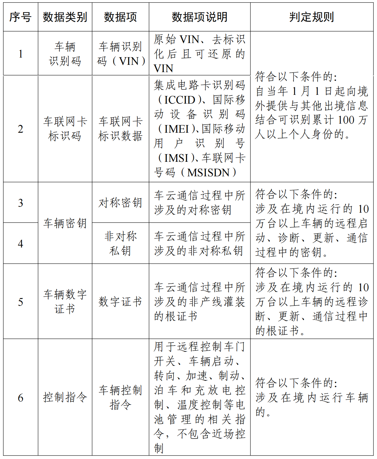 汽车数据处理者在车辆联网运行过程中,收集和产生的车辆识别码、车联网卡标识码、车辆密钥、车辆数字证书、控制指令。