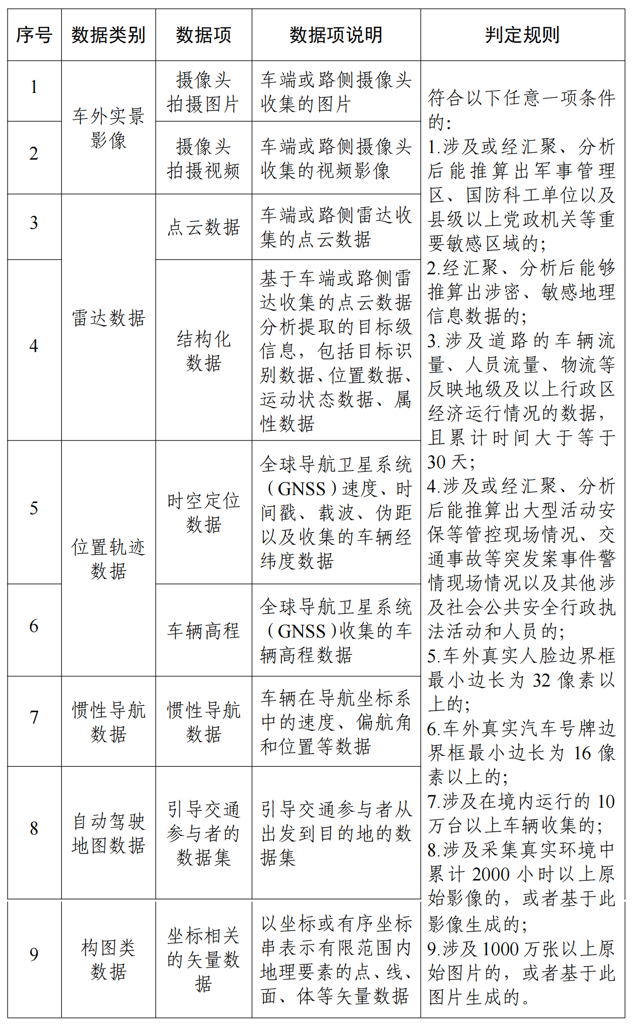 汽车数据处理者在车辆及路侧设备联网运行过程中,收集和产生的车外实景影像、雷达、位置轨迹、惯性导航、自动驾驶地图、构图类数据。